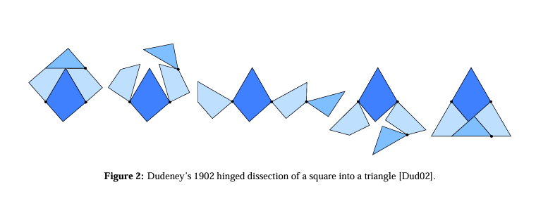 Hinged dissections (here if you want to know way more) are a collection of shapes that are connected by hinges so they can swing from one shape to another. The paper here is more of a geometry problem than anything but has some interesting application to when creating 3D printed works, or any visual work that may provide some inspiration.
